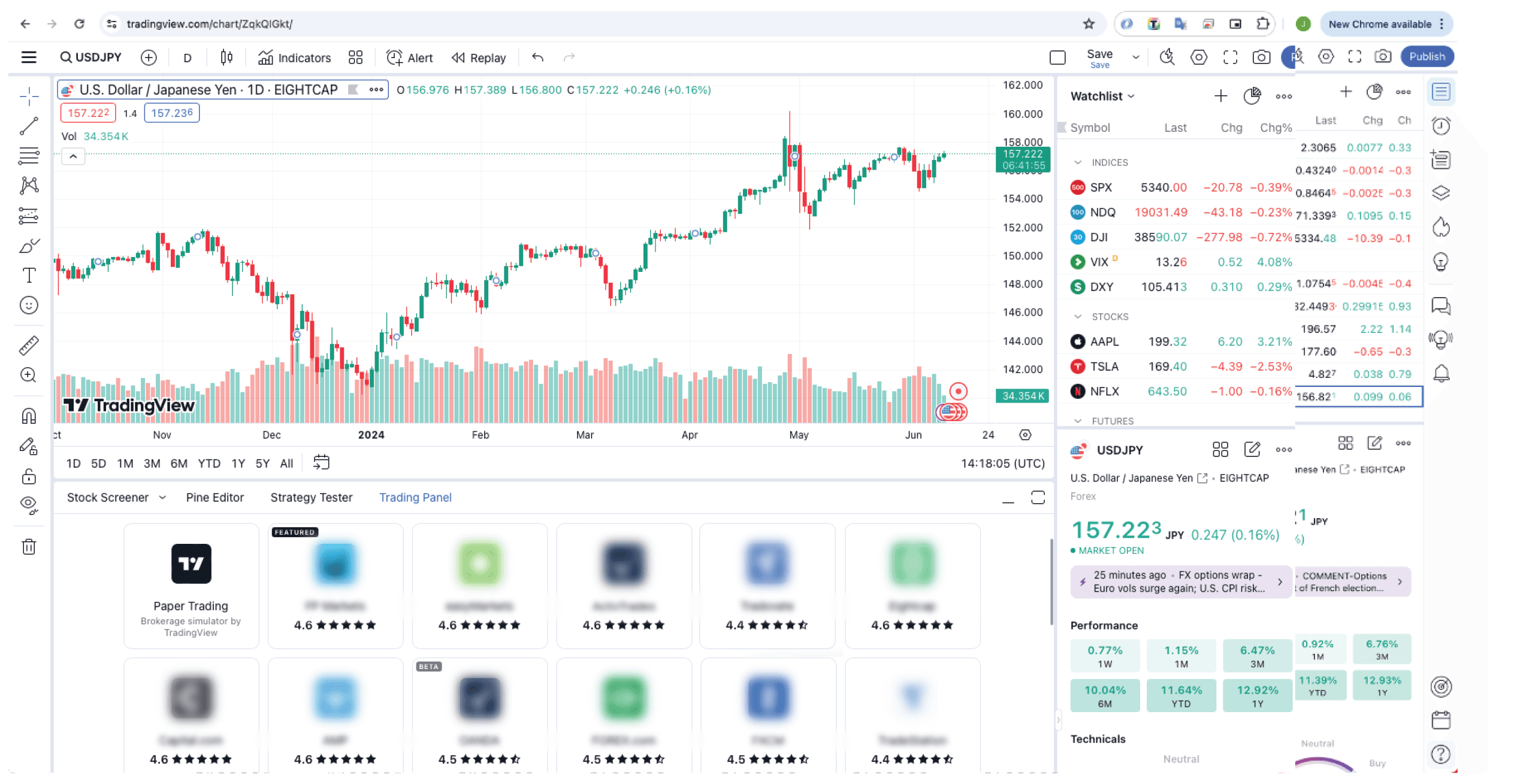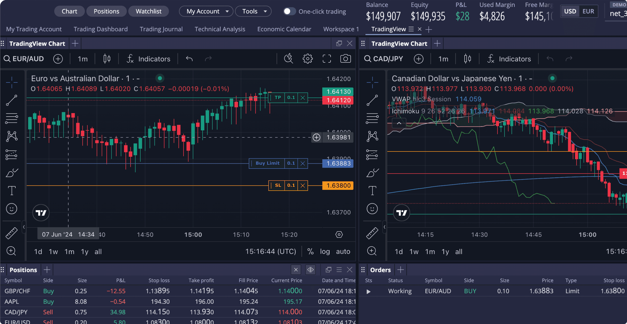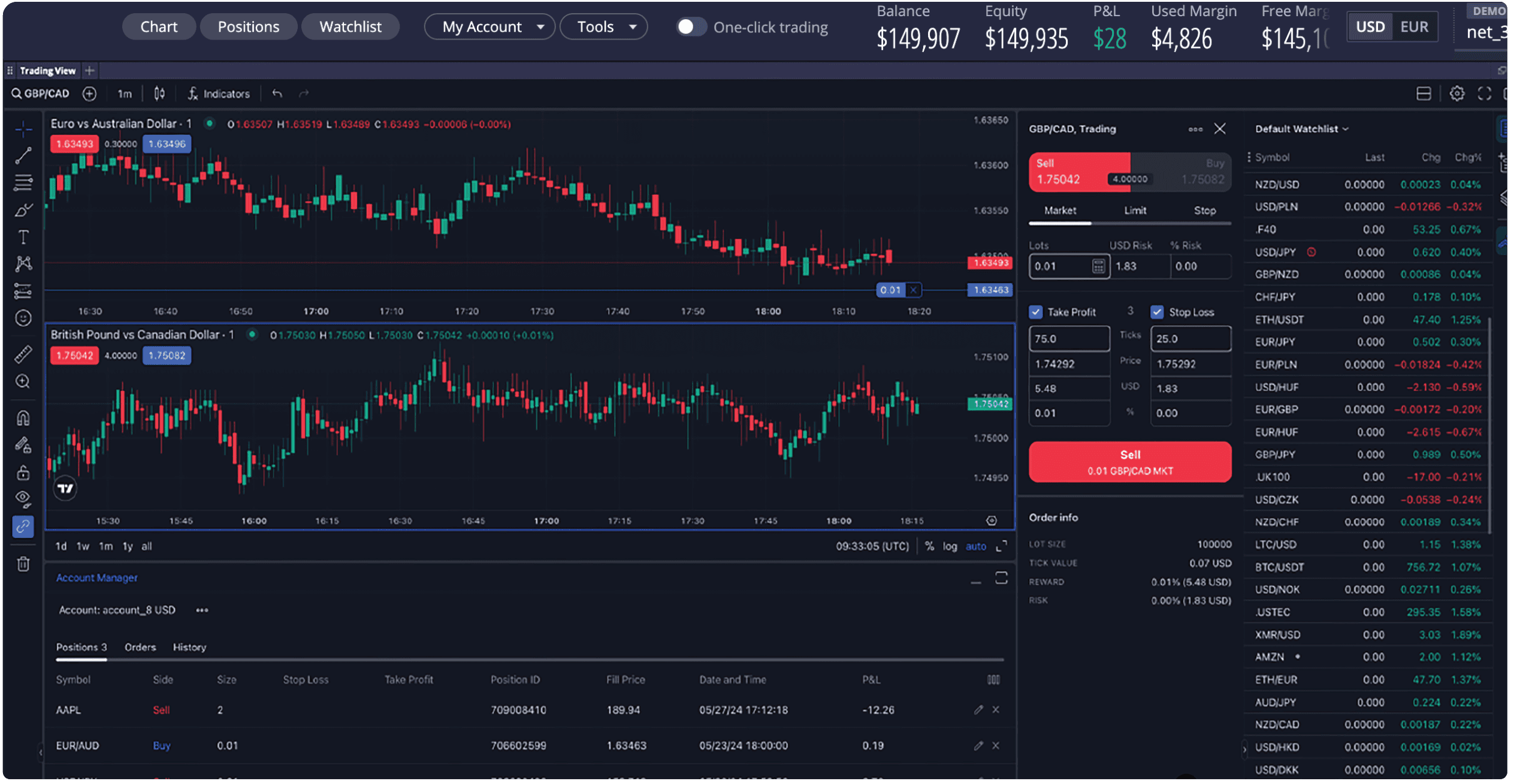 The TradingView library is embedded in DXtrade, enabling brokers to offer a familiar charting experience to their clients.