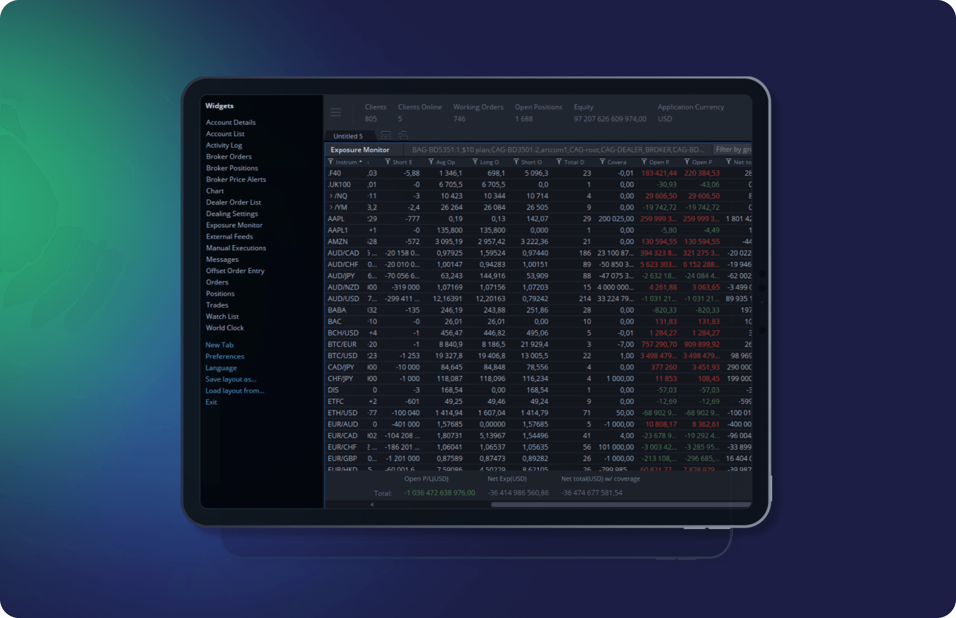 An interface to run your brokerage: support your clients, manage your exposure, and configure dealing settings